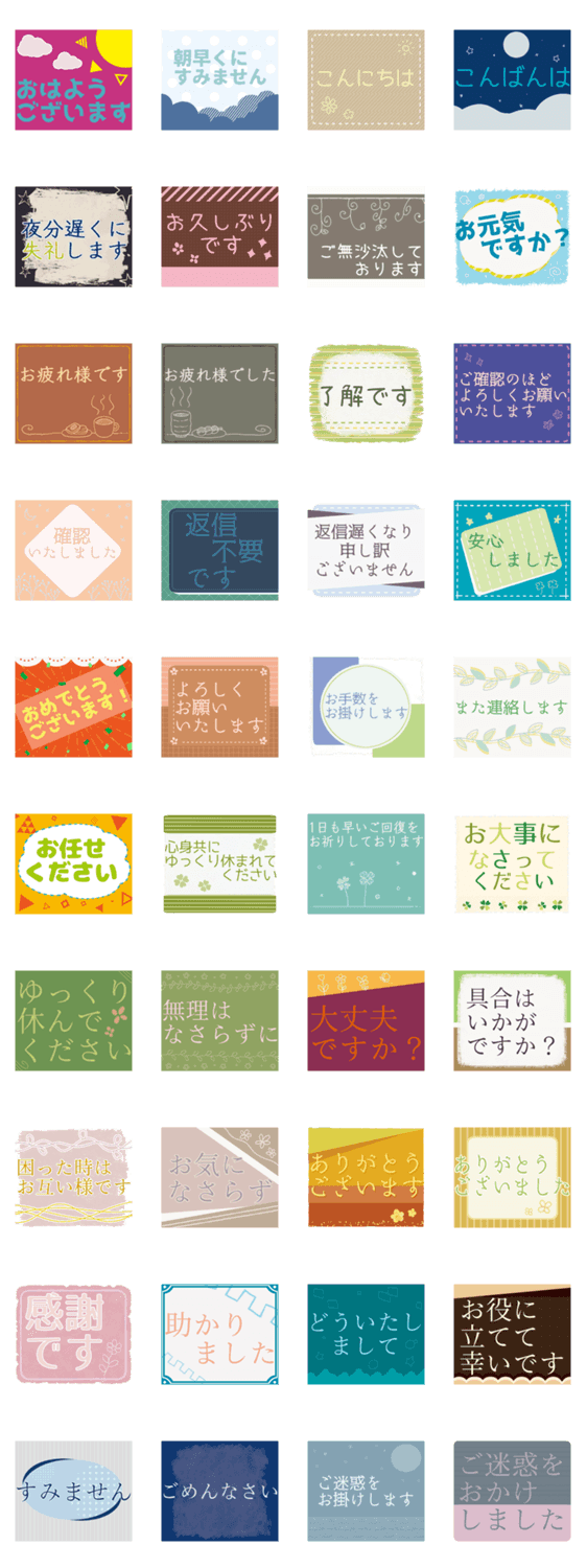 仕事や学校など様々な先輩や同僚に使えそうな大きめ文字のキャラクターなしのスタンプです。 日常挨拶労わるものなどなど。 敬語/キャラなし/カラフル