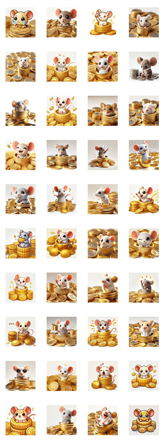 金色のコインから顔を出す可愛いネズミ!様々な表情で、幸運や気持ちを表現できます。