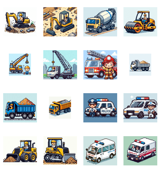 消防車、救急車、パトカー、ブルドーザーなど、おなじみの働く車が勢ぞろい。仕事中の応援や、ちょっとしたコミュニケーションにぴったりです。