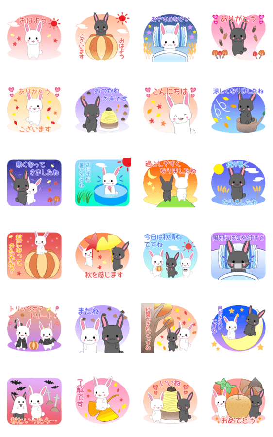 小さいうさぎたちのスタンプ第10弾。兎/ウサギ/白兎/黒兎/カワイイ/可愛い/キュート/もふもふ/モフモフ/挨拶/日常会話/気持ち/感情/秋/ハロウィン