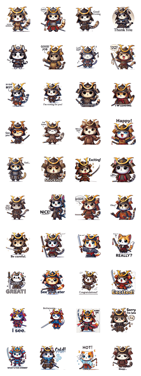 サムライの着ぐるみを纏ったネコが、日常の様々な感情を表現するLINEスタンプ集です。