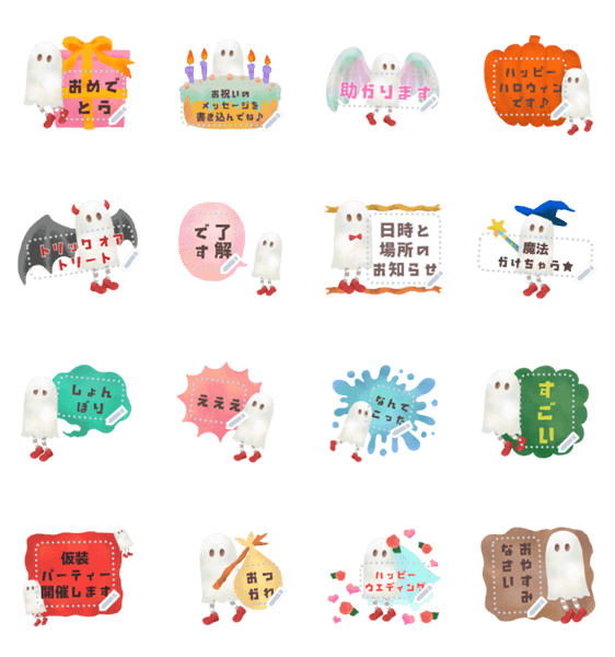 文を書き込めるメッセージスタンプ★絵本みたいなオバケ(ゴースト)のフレーム♪ お誕生日ケーキ/プレゼント/ハロウィン/ウェディング/吹き出し/天使の羽根/デビル/魔法使い 現在この商品は一部のスマートフォン版LINE 10.3.0以上のトークルームでのみ使用できます。動作環境の最新情報はヘルプをご確認ください。