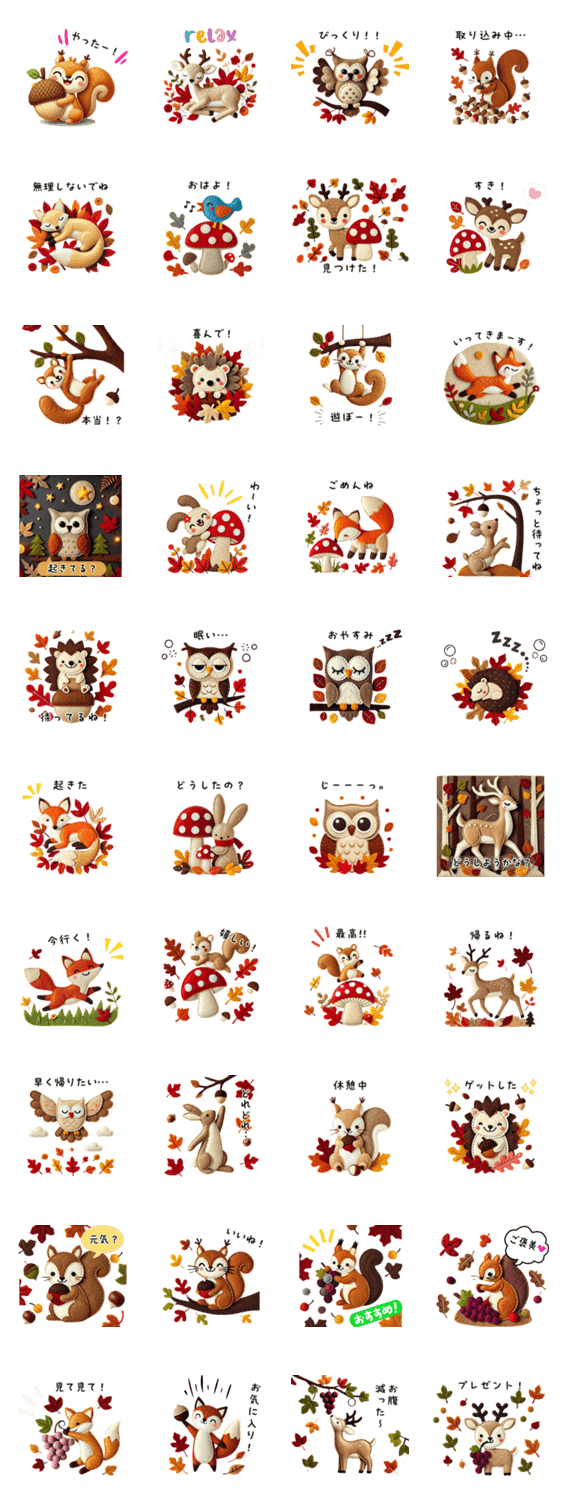 ほっこり癒されるフェルト風デザインの動物たち…ウサギ・リス・キツネ・フクロウ・鹿・ハリネズミたちによる日常使いのスタンプ。挨拶などを伝えるのにピッタリです!