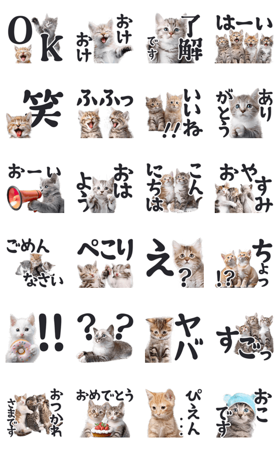 可愛いコネコの写真スタンプ。使いやすい返事に便利。普段使える定番の挨拶や敬語。面白いゆるい仔ねこ。大きいでかもじ老眼おじいさんおばあちゃん推し動物家族友達上司に