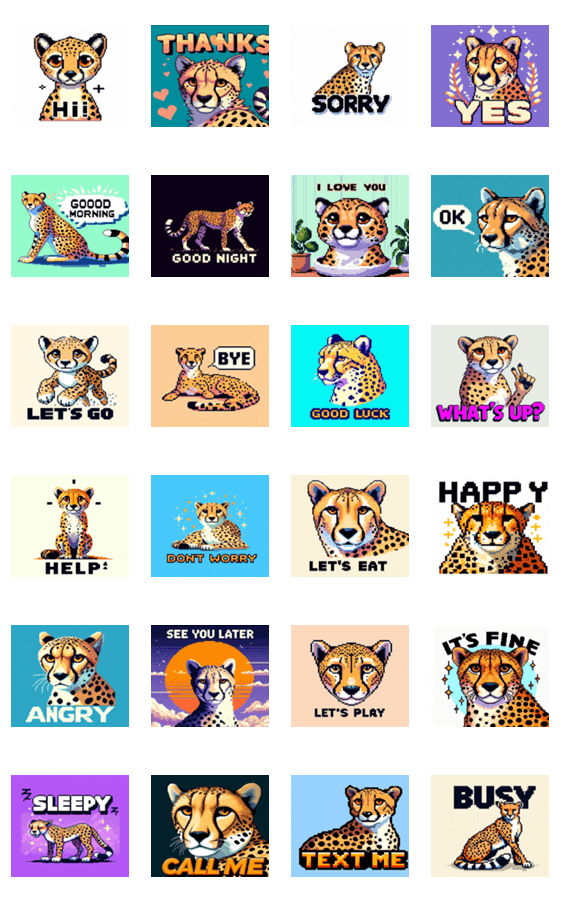 ピクセル化されたチーターが、あなたの日常の感情をスピーディーに表現!会話をさらに楽しく。