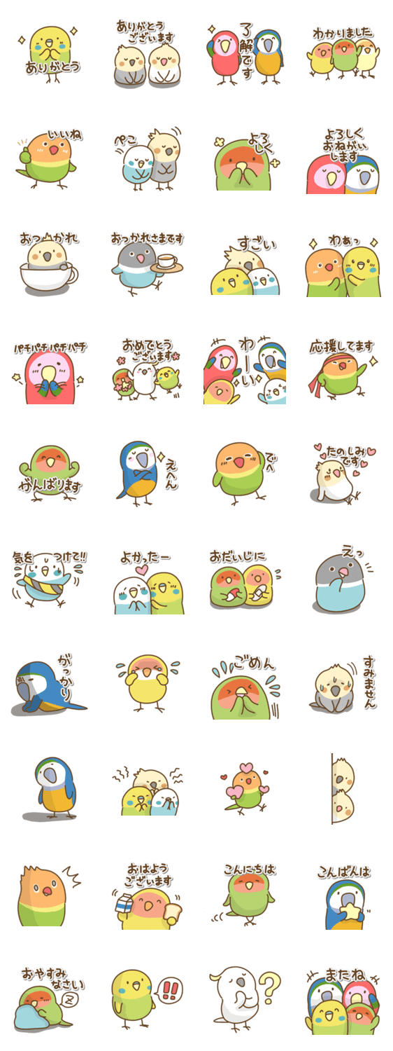 動物の仲間たちから、トリです。セキセイインコ、オカメインコ、ボタンインコ、ベニコンゴウインコ、ルリコンゴウインコ、コザクラインコがいます。