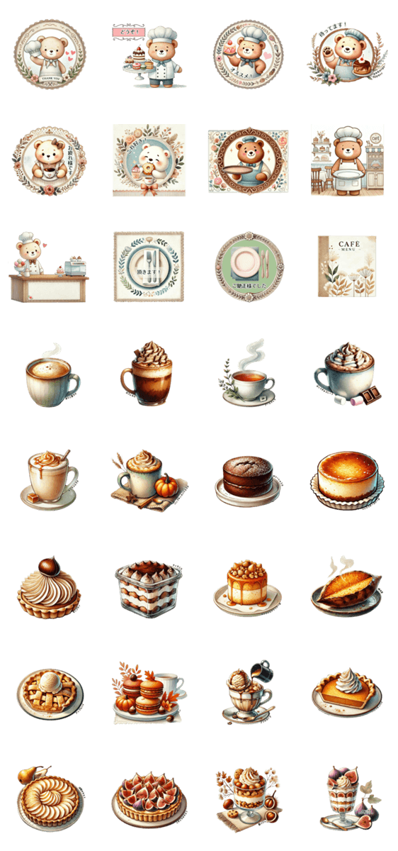 可愛いクマのパティシエが、秋のスイーツやドリンクをお届け!パフェ、ケーキ、ラテなど…美味しそうなメニューがいっぱい。アレンジしてスタンプライフを楽しんで!