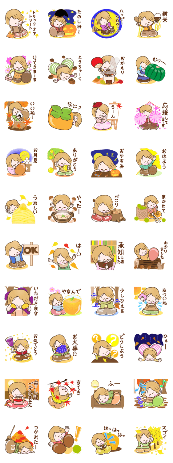 秋の季節にに使いやすい笑顔で元気なスタンプです。トリックオアトリート/ハッピーハロウィン/新米/お月見/少しひえる/あついね等です。