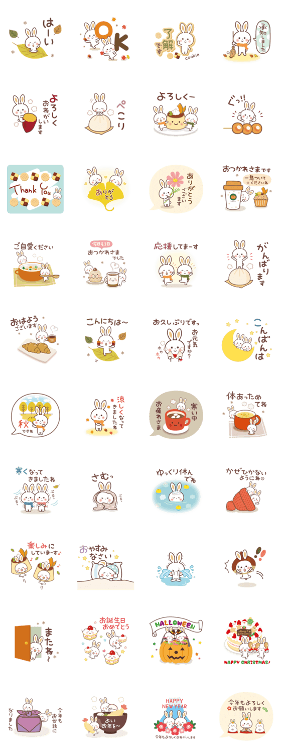 秋〜冬にかけて長〜く使えるスタンプ♡ ふんわり♡うさぎがほっこりやさしいメッセージを届けます。 紅葉/ハロウィン/誕生日/クリスマス/お正月/年末年始のご挨拶♪