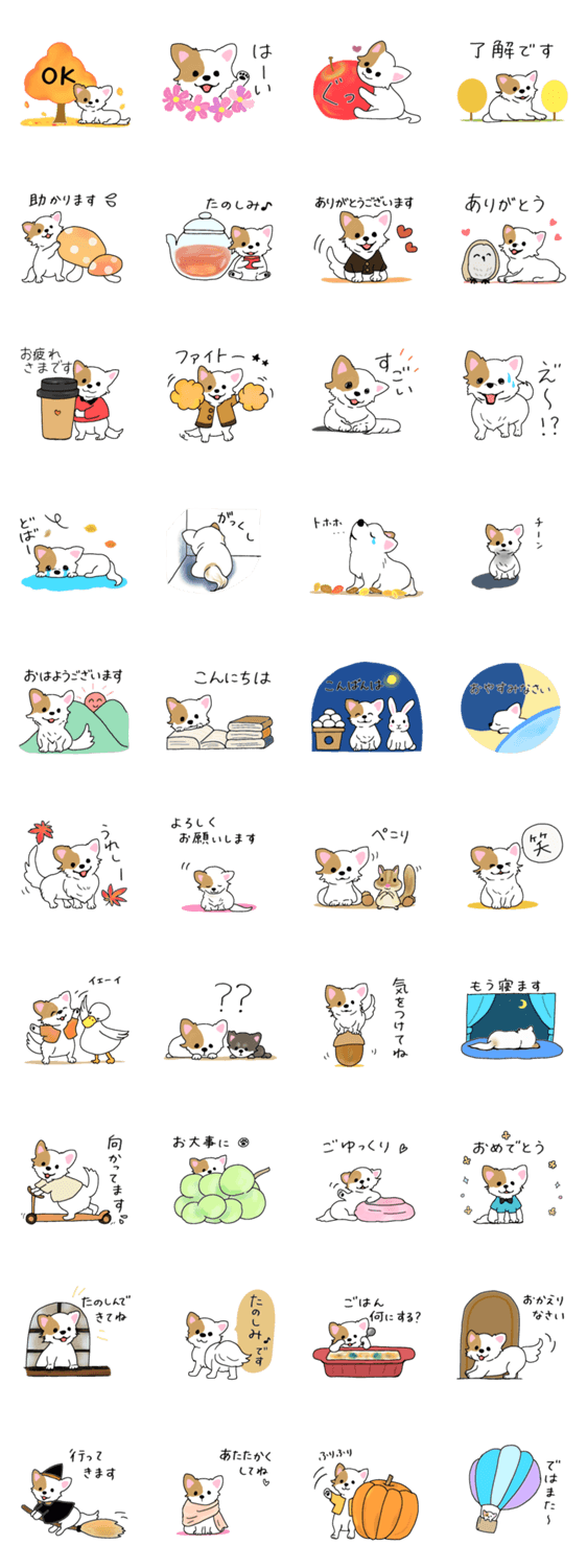 秋をテーマにした日常で使えるスタンプです。犬/チワワ/かわいい/癒し/ほっこり/ゆるい/リス/うさぎ/ふくろう/アヒル/読書/紅茶