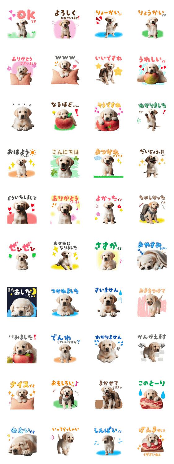 可愛いラブラドールレトリバーの子犬のスタンプで、毎日のやりとりがもっと楽しく!癒し系のデザインで、友達や家族との会話が一気にほっこり。よく使う敬語のスタンプです