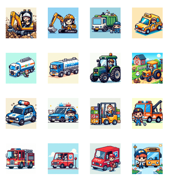 頼もしい働く車たちがみんなに元気を届けるスタンプです。
