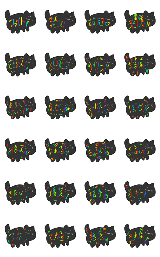 黒猫に書かれているカラフルな文字のスタンプです