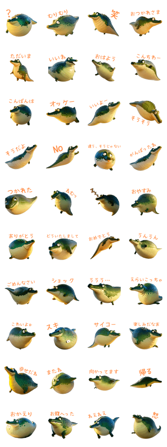 のんびりとした毎日を過ごす、ちょっとドジでかわいいワニが主役のスタンプ。ぷっくりした体型でまるで風船のよう。ふんわり癒し系。クロコダイル、アリゲーター、鰐、デブ