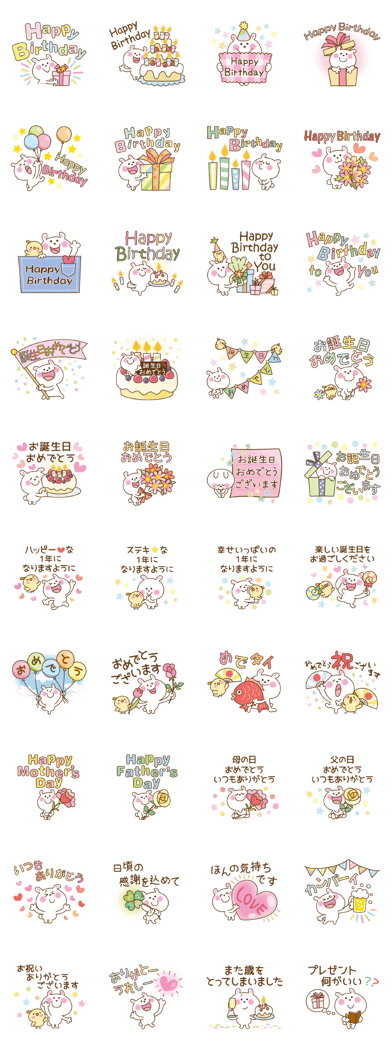 誕生日をお祝いするスタンプです。カラフルでハッピーなスタンプがいっぱい。楽しく可愛く記念日を盛り上げましょう。母の日と父の日のスタンプもありますよ。