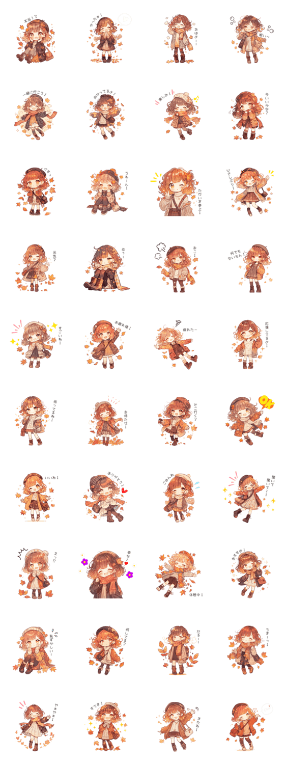 秋らしいニットやマフラーでおしゃれを楽しむセミロングの女の子スタンプです!使いやすいメッセージは40枚、毎日の会話に季節感と可愛さをプラスしてみませんか?