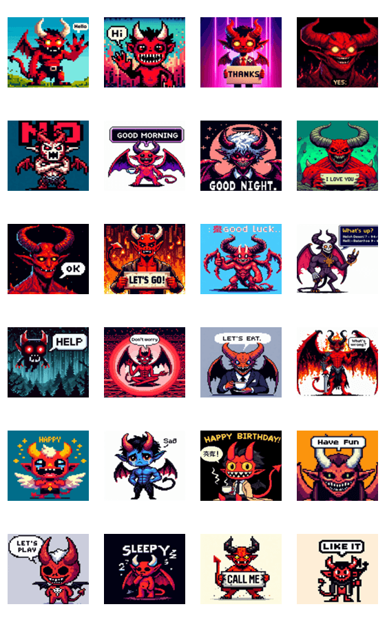 ピクセル魔人が感情豊かに表現するスタンプセット。日常の会話を楽しく彩りましょう!