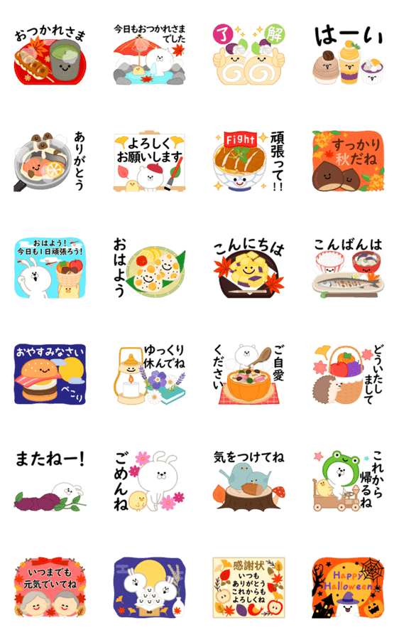 秋〜毎日使えるあいさつや便利気づかい集。楽しく動く!見やすい文字!ありがとう/了解/よろしく/おつかれさま/寒い/敬老の日/勤労感謝の日/お月見/ハロウィン/紅葉/でか文字
