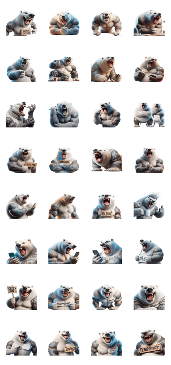激怒する北極熊ボスが甘える、北極熊、激怒、ボス、甘える、面白い、イラスト、キャラクター、LINEスタンプ、動物、ユーモア、楽しい、絵文字ステッカー、