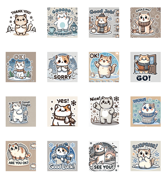 | スタンプ説明 | ありがとう おはよう おつかれ すごい 了解 ごめんね OK いってきます おやすみ はい いいね やった だいじょうぶ? がんばって またね びっくり |