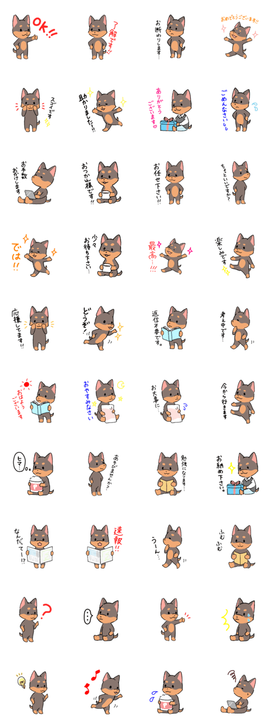 ミニチュアピンシャーをモチーフにした、ゆるい感じのキャラクターのスタンプです。