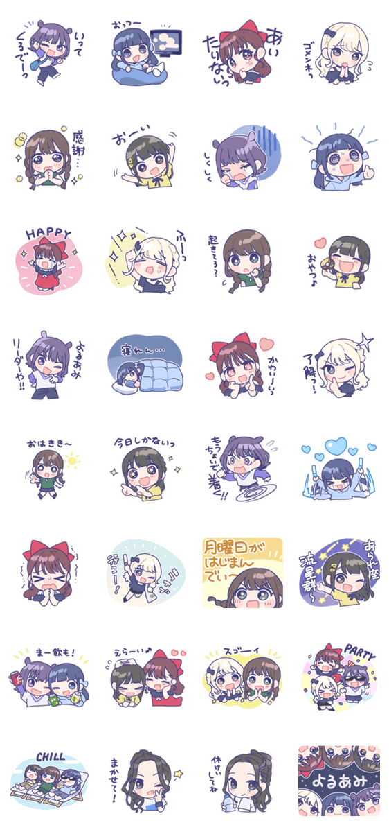 よるあみスタンプの第二弾が登場!今回は新体制の6人にサポートメンバーだったミアも登場!全32種類あるのでお友達とたくさん送ってね〜!