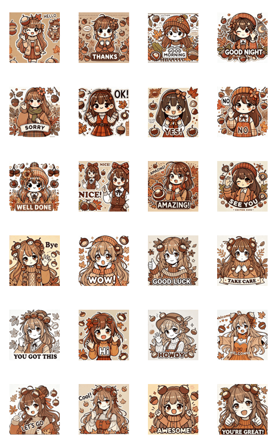 | スタンプ説明 | ありがとう おはよう おつかれ すごい 了解 ごめんね OK いってきます おやすみ はい いいね やった だいじょうぶ? がんばって またね びっくり |