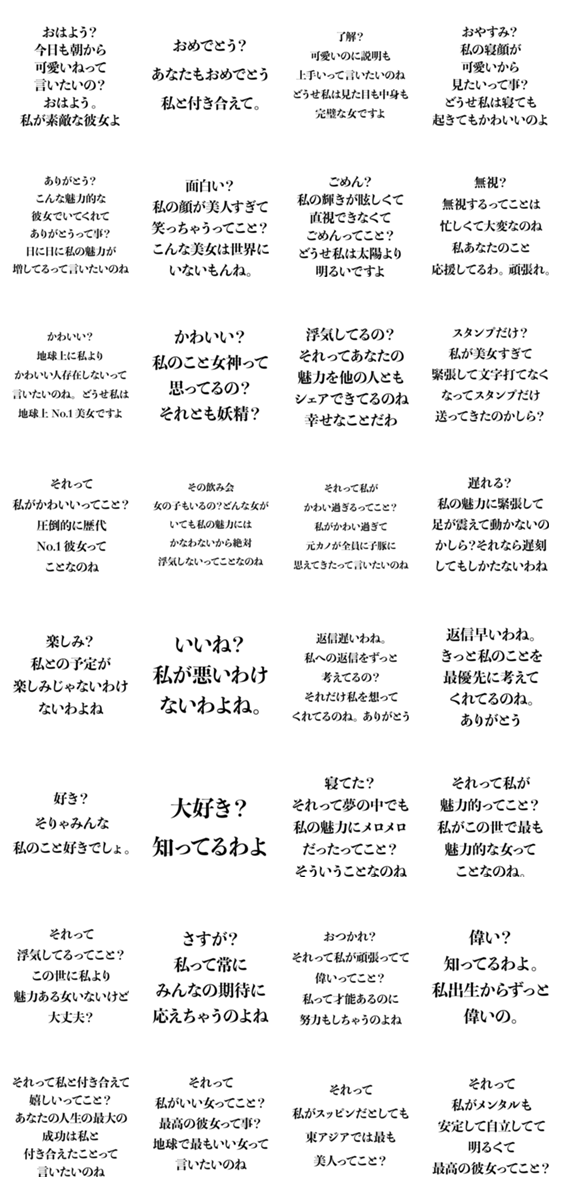 | スタンプ説明 | 彼氏、夫婦、旦那、嫁、夫婦、ポジティブ、面白い、ネタ、ギャグ、ヒス構文、例文、笑える、ラブラブ、イチャイチャ、毎日使える |