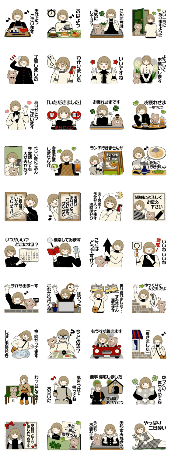 日常使える定番フレーズにお誘いや待ち合わせで使えそうな表現を加えた便利なスタンプです。シックなおでかけモードで 日常/挨拶/連絡/お誘い/待ち合わせ/家族/友人/敬語