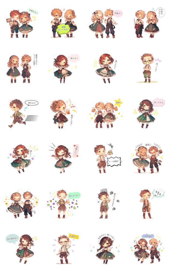 ディアンドルとレーダーホーゼンを着たかわいい男女のキャラたちが、カジュアルな飲み会の連絡をサポートします。楽しい乾杯シーンで、仲間との会話を盛り上げましょう!