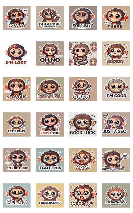 かわいくて表情豊かなうるうるアウストラロピテクスのスタンプで、会話を盛り上げよう!感情や楽しさを共有するのにぴったり。