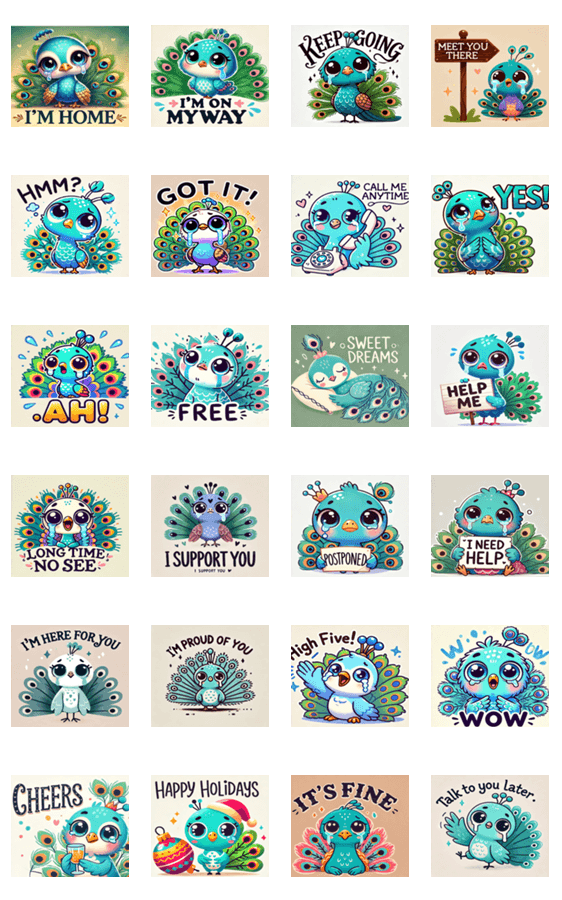 涙目のかわいいクジャクが喜びや驚きなど感情を表現するスタンプセットです。あなたのチャットに個性をプラスします!