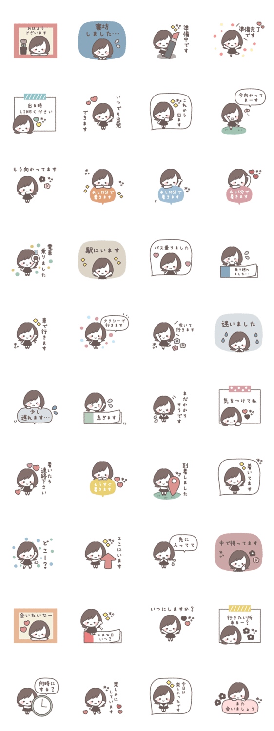 一つあると便利な女の子のスタンプです。 女の子/ボブ/大人可愛い/シンプル/あいさつ/吹き出し/くすみカラー/待ち合わせ