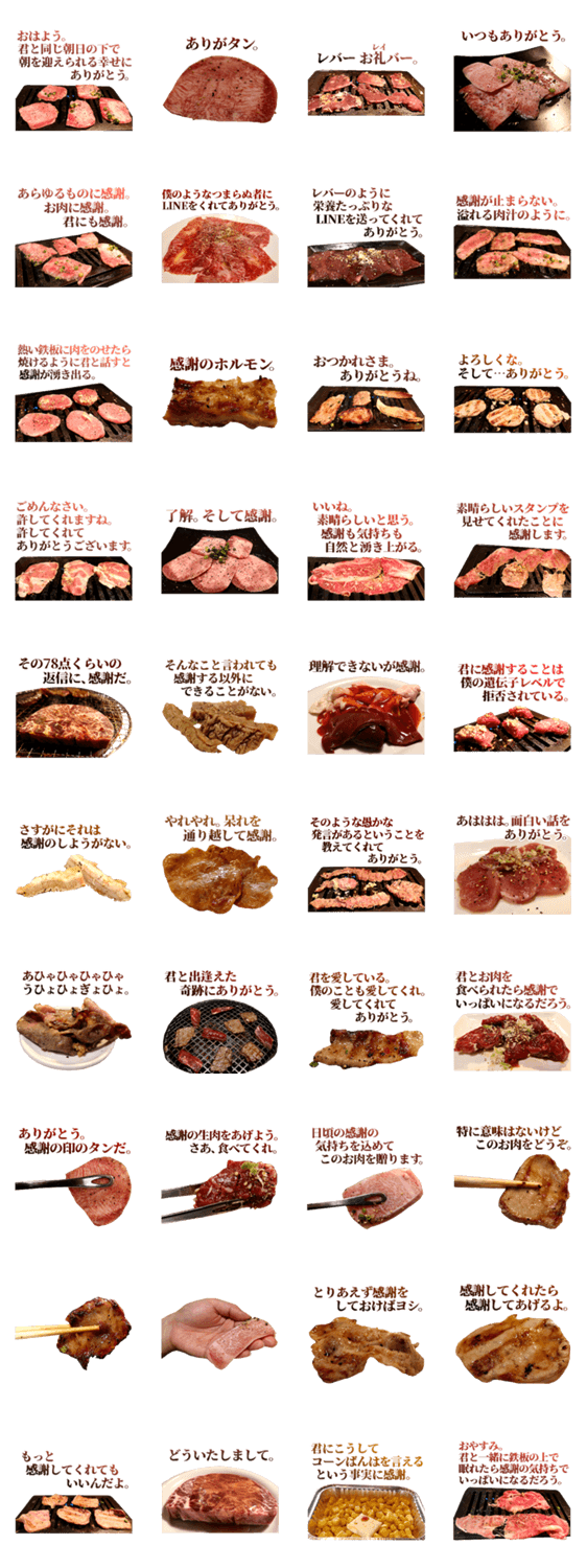 焼き肉が猛烈にひたすらに感謝するスタンプです。感謝と肉があれば人は生きていける。やきにく、ヤキニク、牛肉、牛タン、タン塩、ホルモン、霜降り、レバー、飯テロ。