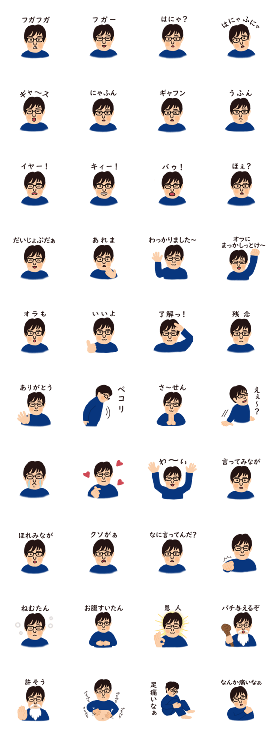 永遠の少年「メガネ男」が独特な擬音語で会話をするスタンプです。 実用性はあまりありません。