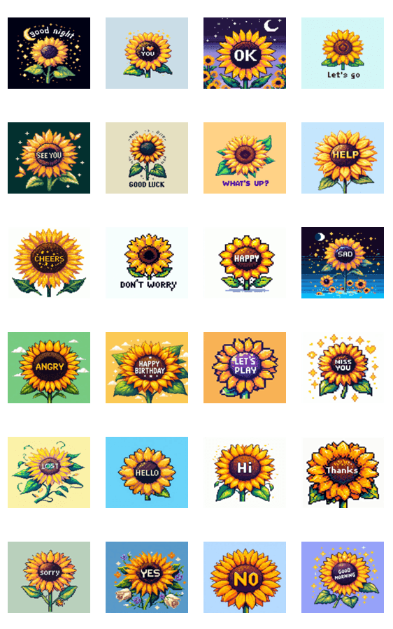 明るくてかわいいピクセルヒマワリのスタンプで、チャットを楽しく彩りましょう。メッセージに陽だまりのような暖かさを添えます。