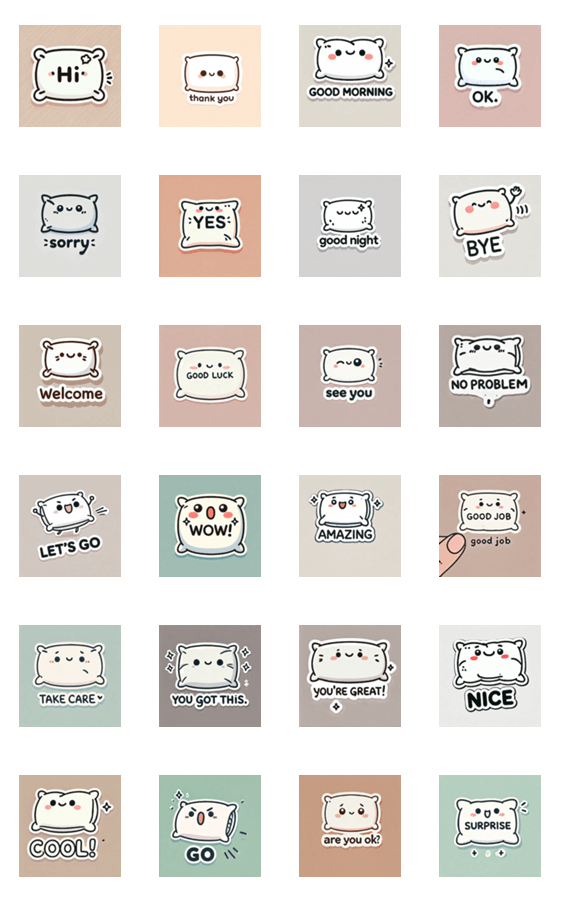 | スタンプ説明 | ありがとう おはよう おつかれ すごい 了解 ごめんね OK いってきます おやすみ はい いいね やった だいじょうぶ? がんばって またね びっくり |