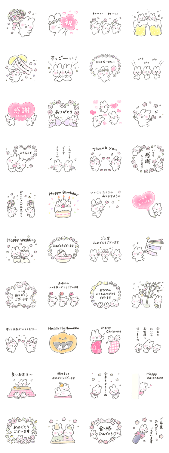 かわいいうさぎのお祝いスタンプ。誕生日やハロウィン、クリスマス、お正月、入学、卒業など季節のイベント行事に♡お花と一緒にありがとう、おめでとうを伝えてね!