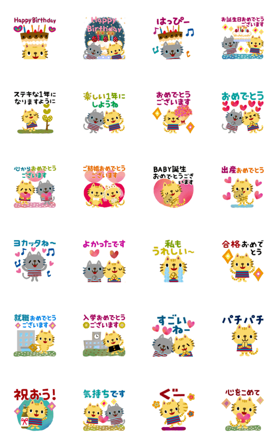ちびねこのお祝いスタンプです。 お誕生日、結婚、出産、入学、就職、合格など色んなお祝いに使えます♡