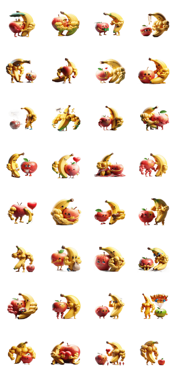 | スタンプ説明 | "バナナがリンゴに恋する、ロマンス、誘惑、果物キャラクター、面白い、LINEスタンプ、イラスト、コミュニケーション、 |