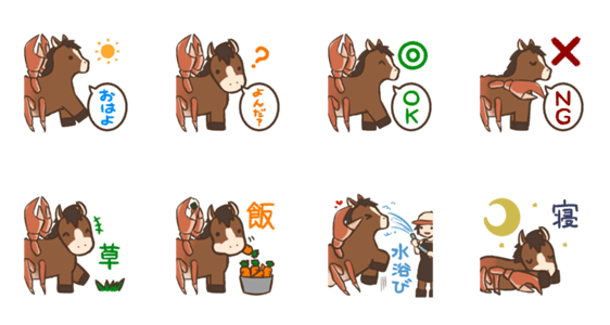 駿河王国で大人気の! 馬×カニのキメラ「スルバガニ」がスタンプで登場。日常で使いやすい言葉を集めてみました!