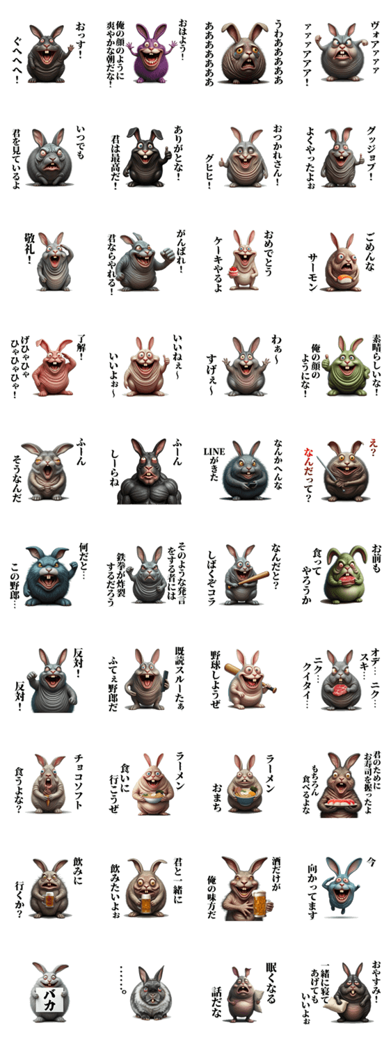 普通に気持ち悪いウサギのスタンプです。よく見ると可愛いかもしれない。きもい、うざい、ウザい、ホラー、怖い、ウサギ、うさぎ、ラビット、お寿司、ビール、ラーメン。