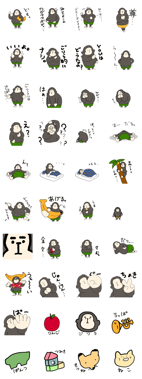 めんどくさがりなゴリラのスタンプです。しりとりとじゃんけんができるよ