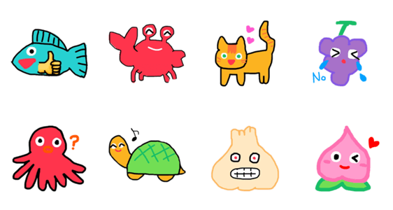 | スタンプ説明 | サカナ☆かに☆ネコ☆ぶどう☆タコ☆かめ☆ニンニク☆もも☆ |