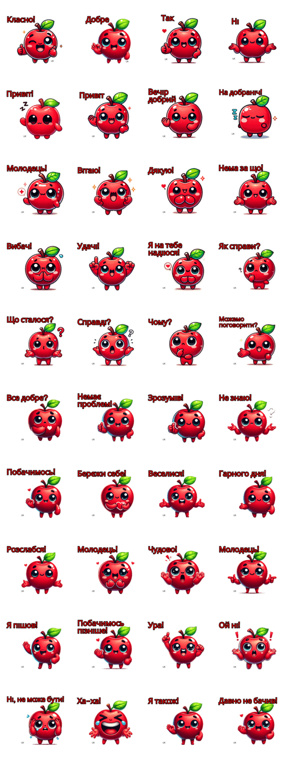 | スタンプ説明 | 可愛いりんごのキャラクターが描かれたスタンプでウクライナ語のテキストが入っています。よく使われるフレーズや表現が含まれています。 |