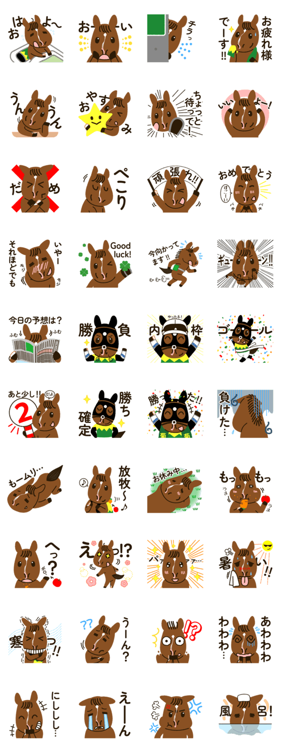 | スタンプ説明 | 日本の元競走馬、タイトルホルダーのスタンプ。日常会話を可愛く楽しくしてくれます。競馬好き同士で楽しく使ってくださいね♪馬主様より肖像権使用許諾取得しました。 |