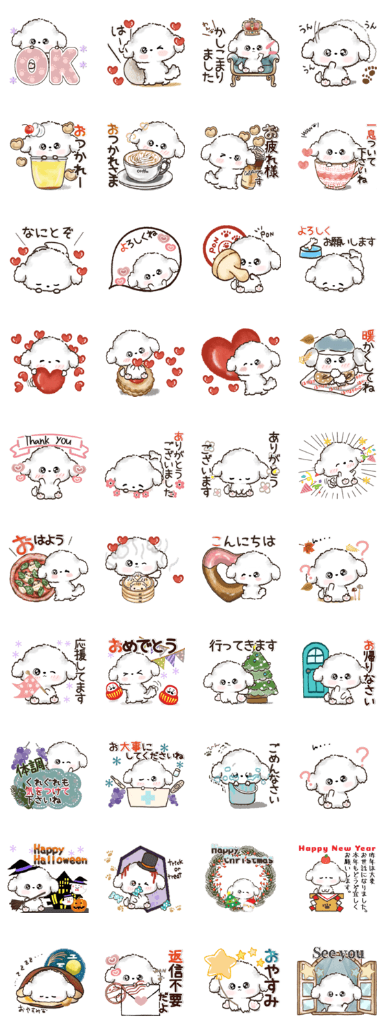 キュートなワンコが使い易いスタンプでご挨拶するよ♡大切な人に丁寧に伝えます♪秋/ビションフリーゼ/挨拶/年中/愛犬/モフモフ/毎日/尊敬語/ありがとう/おはよう/Bnasuko