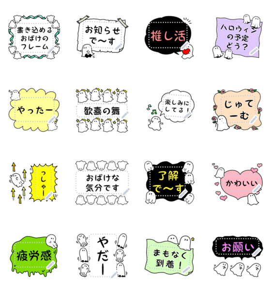 ポップで可愛いおばけちゃんの文章を書き込める吹き出しやフレーム★おばけストリートの絵文字や着せかえも販売中★ ハロウィンにも♪ ストリート系メッセージスタンプ♪ 現在この商品は一部のスマートフォン版LINE 10.3.0以上のトークルームでのみ使用できます。動作環境の最新情報はヘルプをご確認ください。