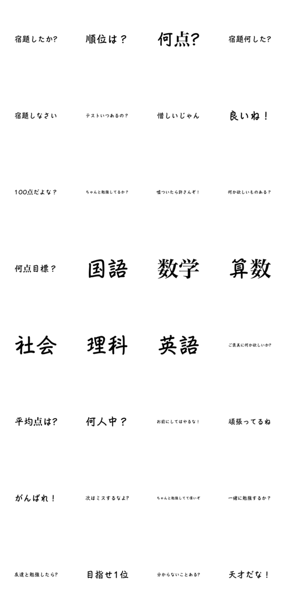 | スタンプ説明 | 宿題やテストなどについて聞いたり,ご褒美が欲しいか聞ける |