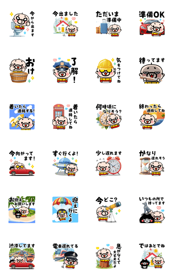 おやじ君の可愛い待ち合わせスタンプ。カラフルなイラストに癒されること間違いなし!友達、夫婦、家族、親子の会話で楽しく使ってね!